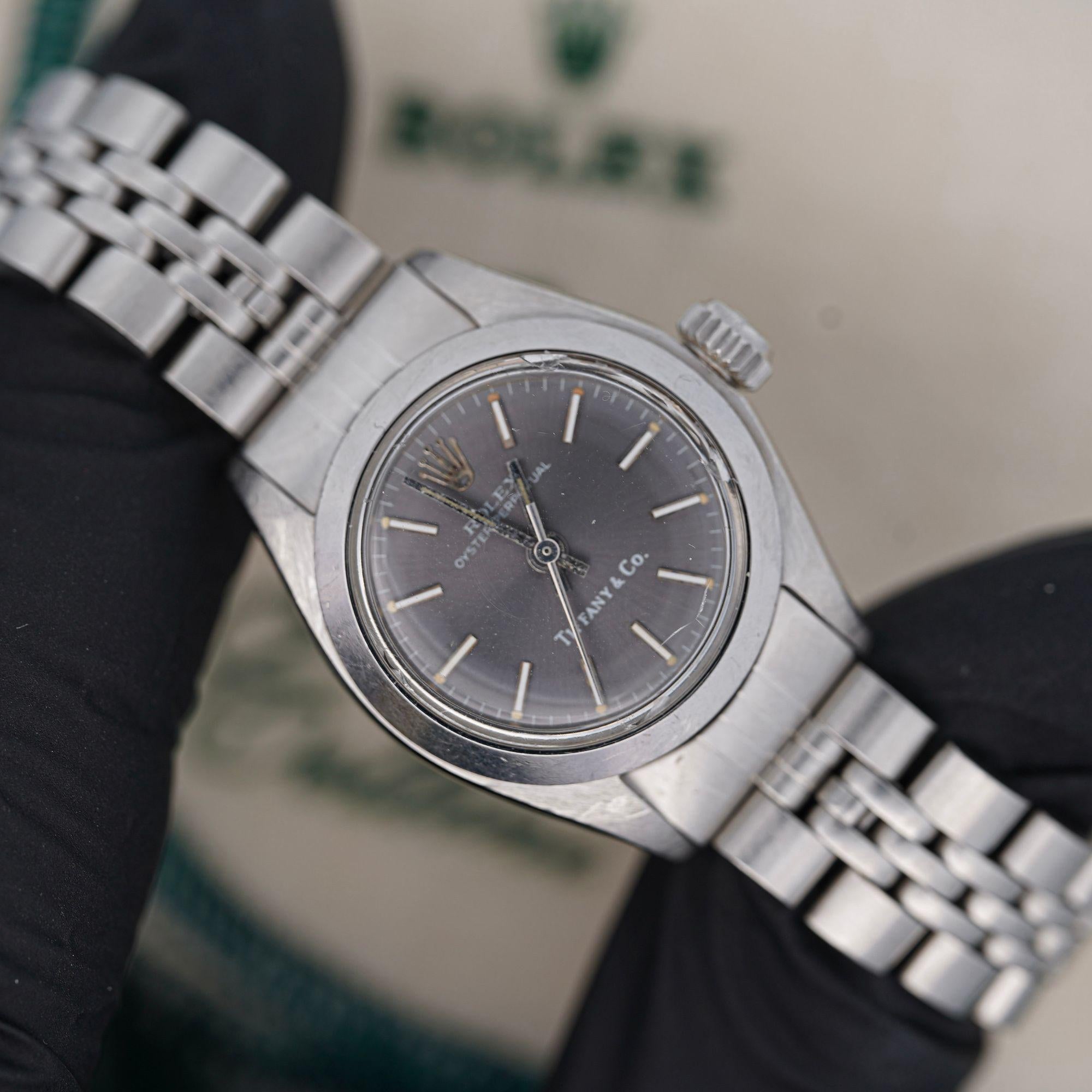 Rolex's partnership with Tiffany and Co represents one of luxury retail's most prestigious collaborations. Tiffany and Co served as authorized Rolex retailer, with select pieces receiving the jeweler's signature on the dial at 6 o'clock position. These co-branded watches remain highly collectible for their dual-branded heritage combining Swiss watchmaking excellence with American luxury retail prestige. The reference 6718 Oyster Perpetual represents classic ladies watch design from this era. Original condition with natural aging patina adds authenticity and vintage character. Rolex for Tiffany and Co watches command premium collector interest due to limited production and prestigious provenance.