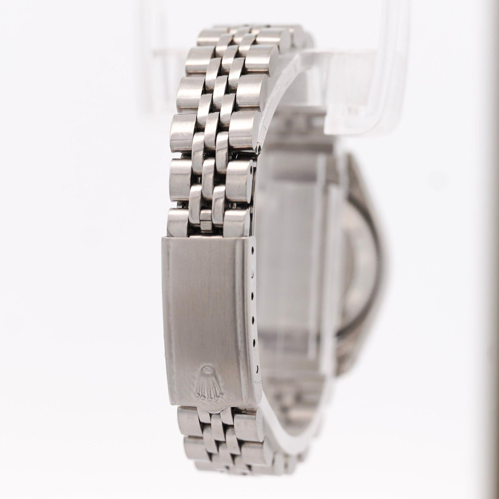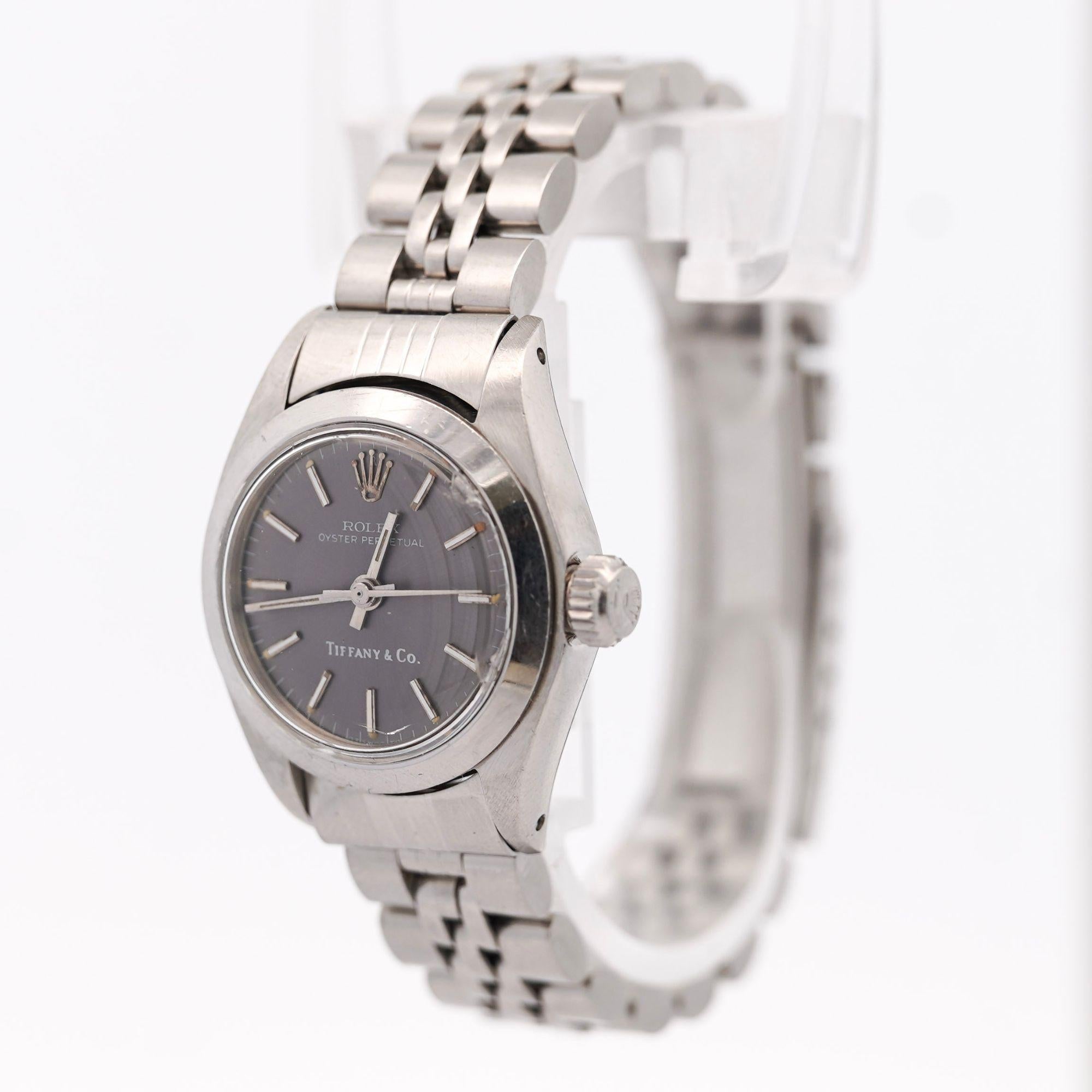 Smooth fixed bezel in stainless steel creates refined profile suitable for dress occasions. Light gray satin finish dial provides subtle texture with white printed outer chapter ring. Applied luminous baton hour markers ensure legibility with period-correct tritium aging to warm patina. Luminous baton-shaped hands with aged tritium match dial markers. White Tiffany and Co signature at 6 o'clock confirms prestigious retail partnership. Oyster case construction with screw-down crown ensures water resistance. Five-piece jubilee bracelet made in USA provides comfortable articulated fit. Folding Oysterclasp maintains secure closure. Acrylic crystal typical of vintage Rolex models.