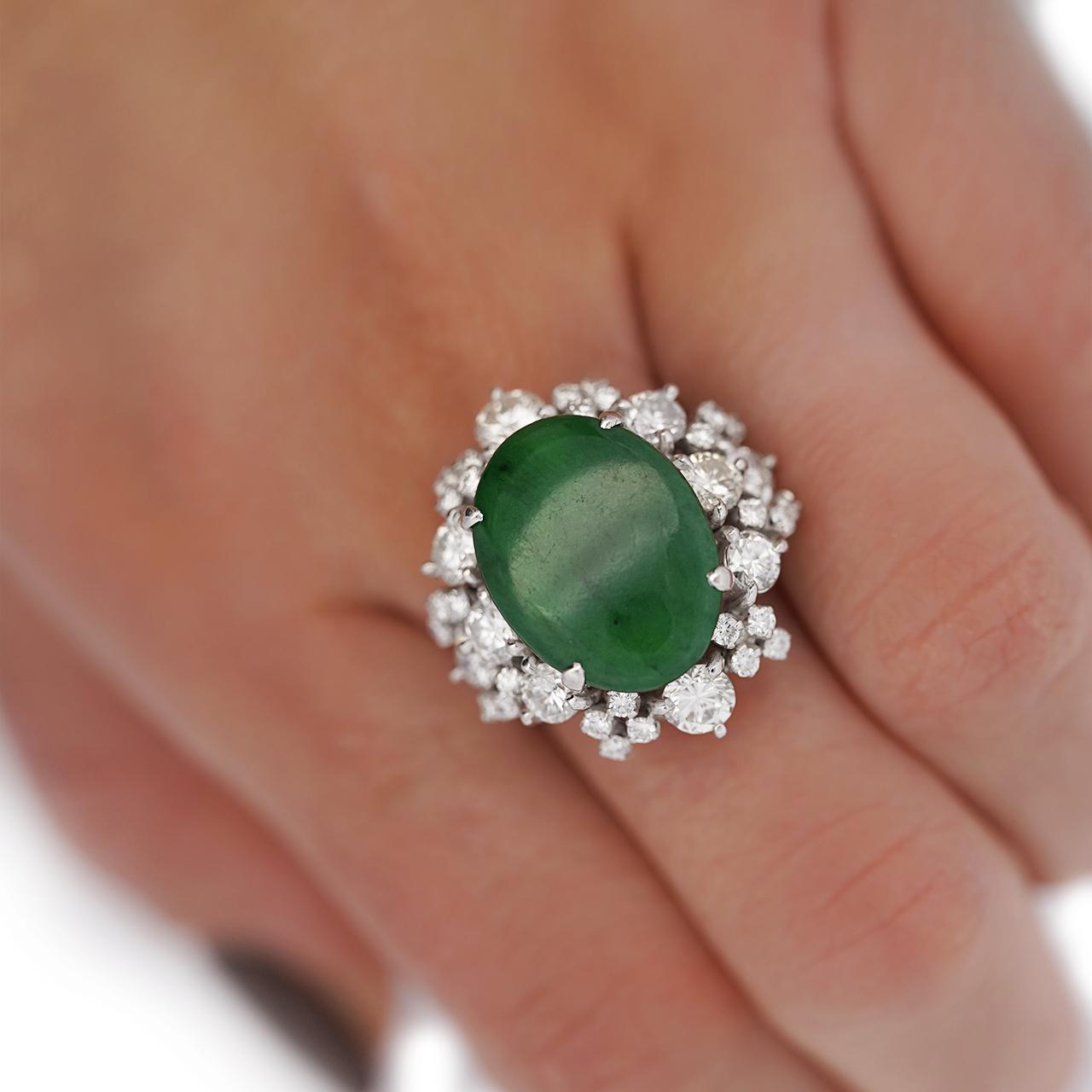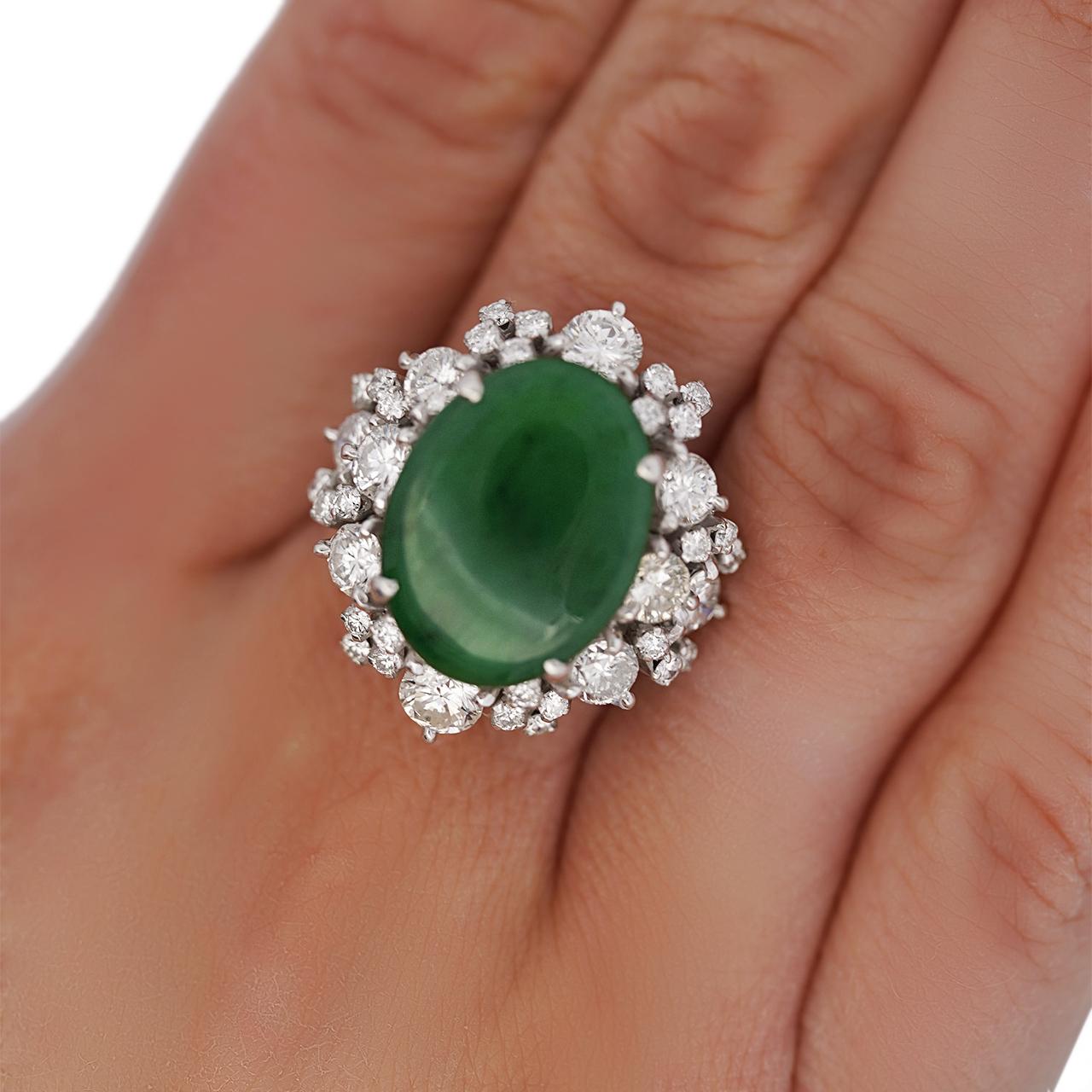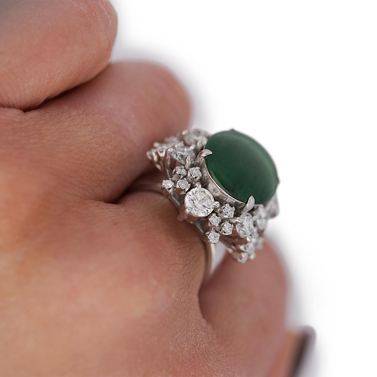 The setting is a classically proportioned double-row starburst cluster in 18K white gold, with round brilliant old cut diamonds of varying sizes arranged in two concentric radiating rows around the jade cabochon — larger diamonds anchoring the outer border and smaller stones filling the inner row, creating a full sunburst effect that dramatically frames the deep green jade center. The individual prong mounts for each diamond are raised, giving the cluster dimensional depth and allowing each stone to be viewed in full from above, while the high-polish white gold shank provides a clean, substantial base for the imposing head. The overall silhouette is reminiscent of the finest mid-century estate jewelry, where cluster diamond surrounds were the premier setting style for important colored gemstones.