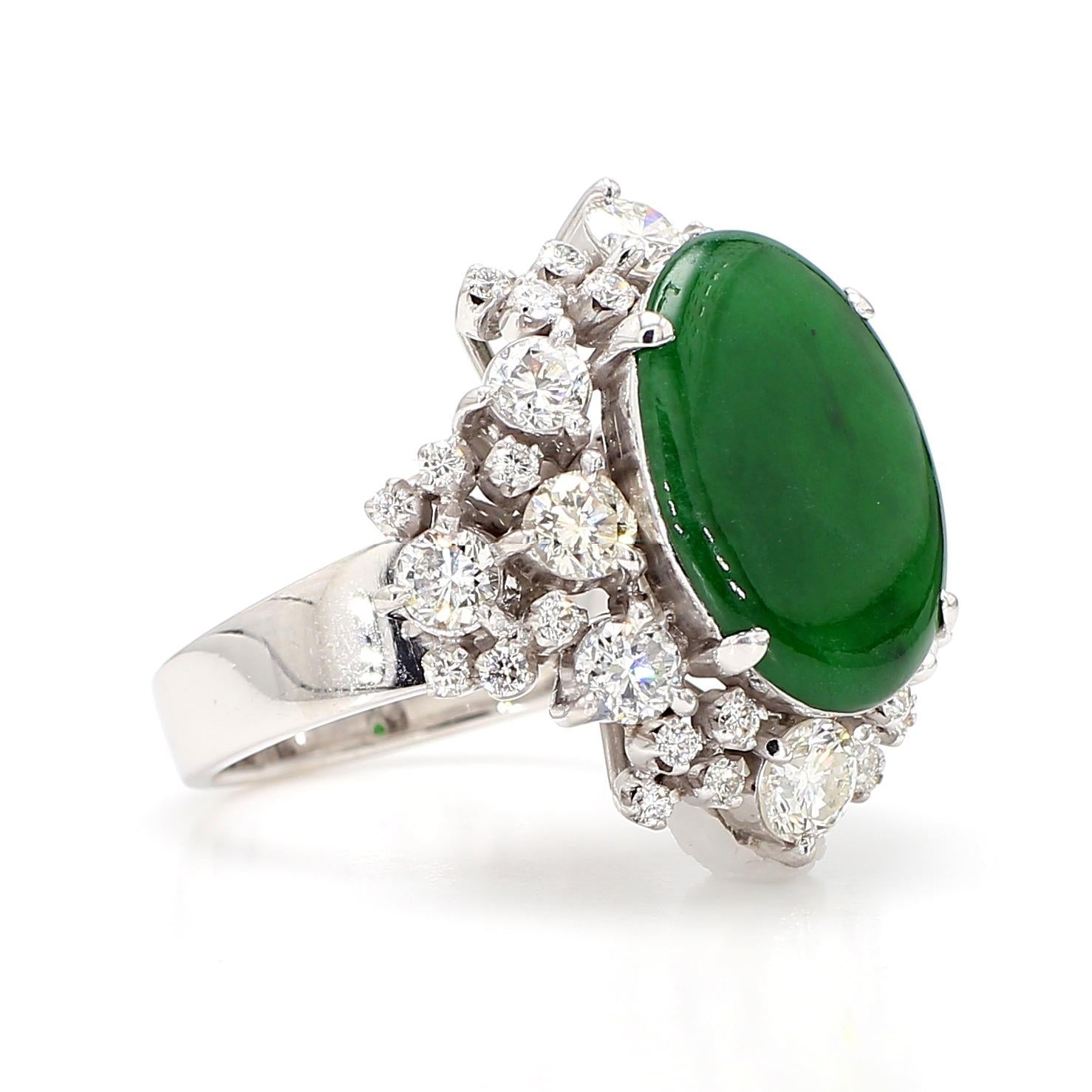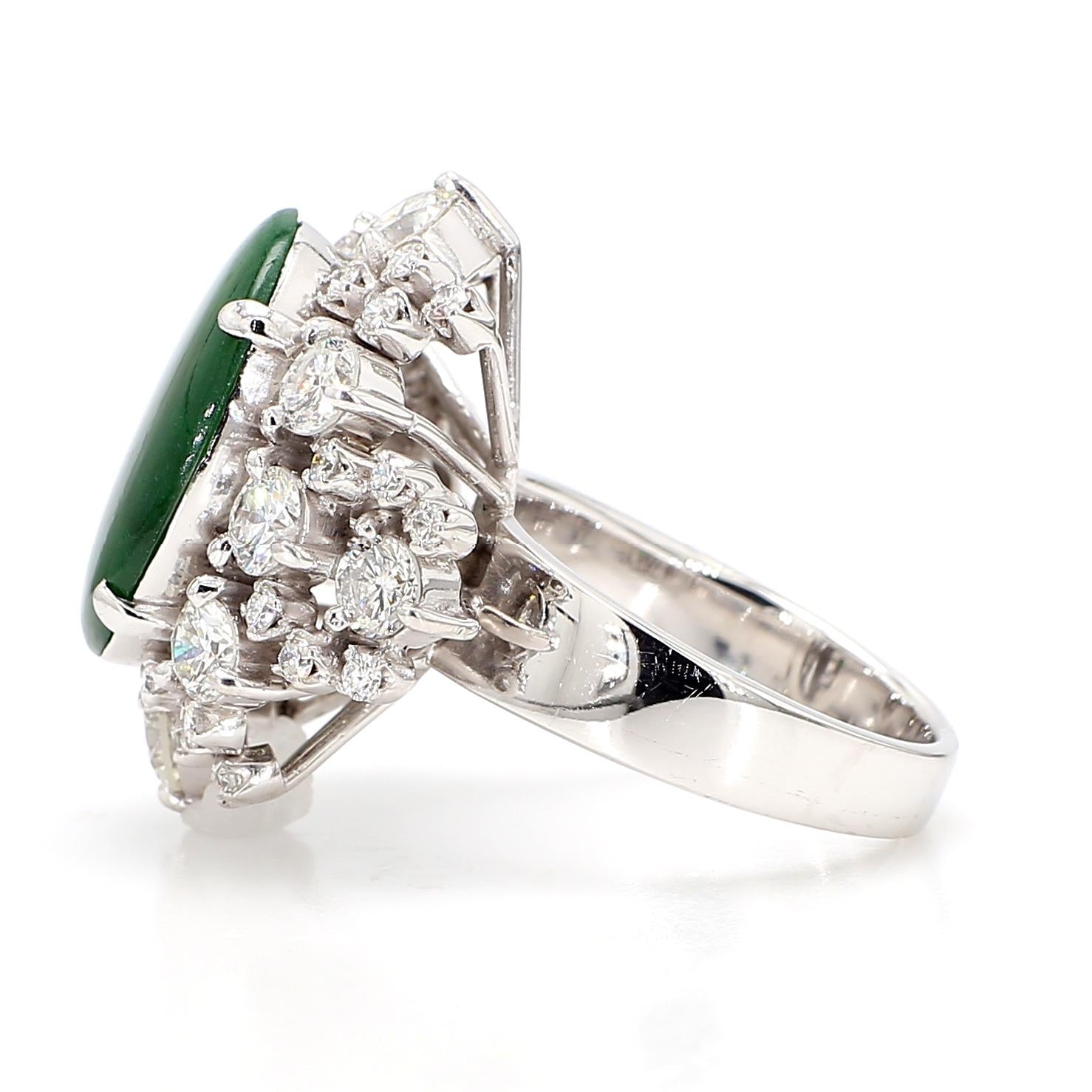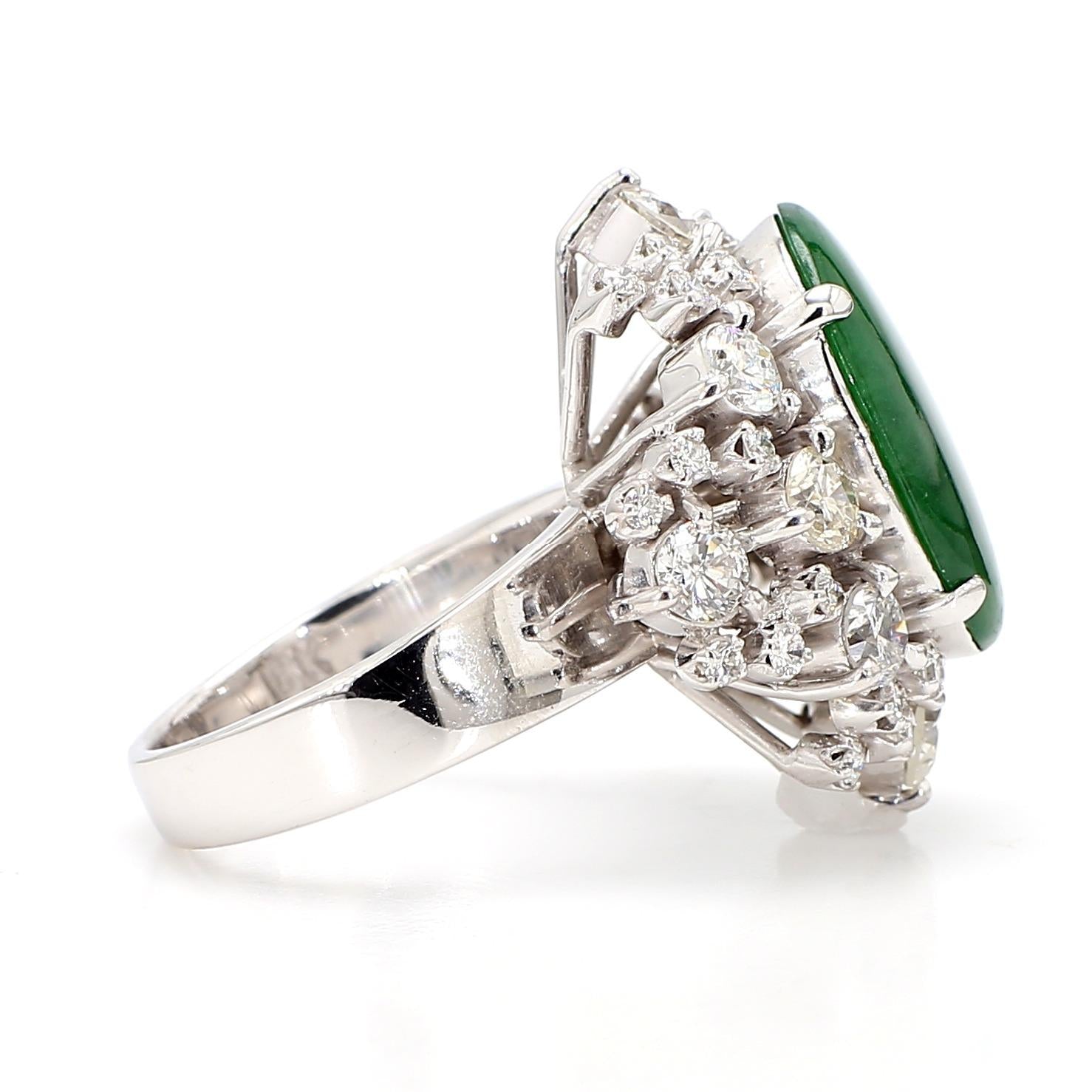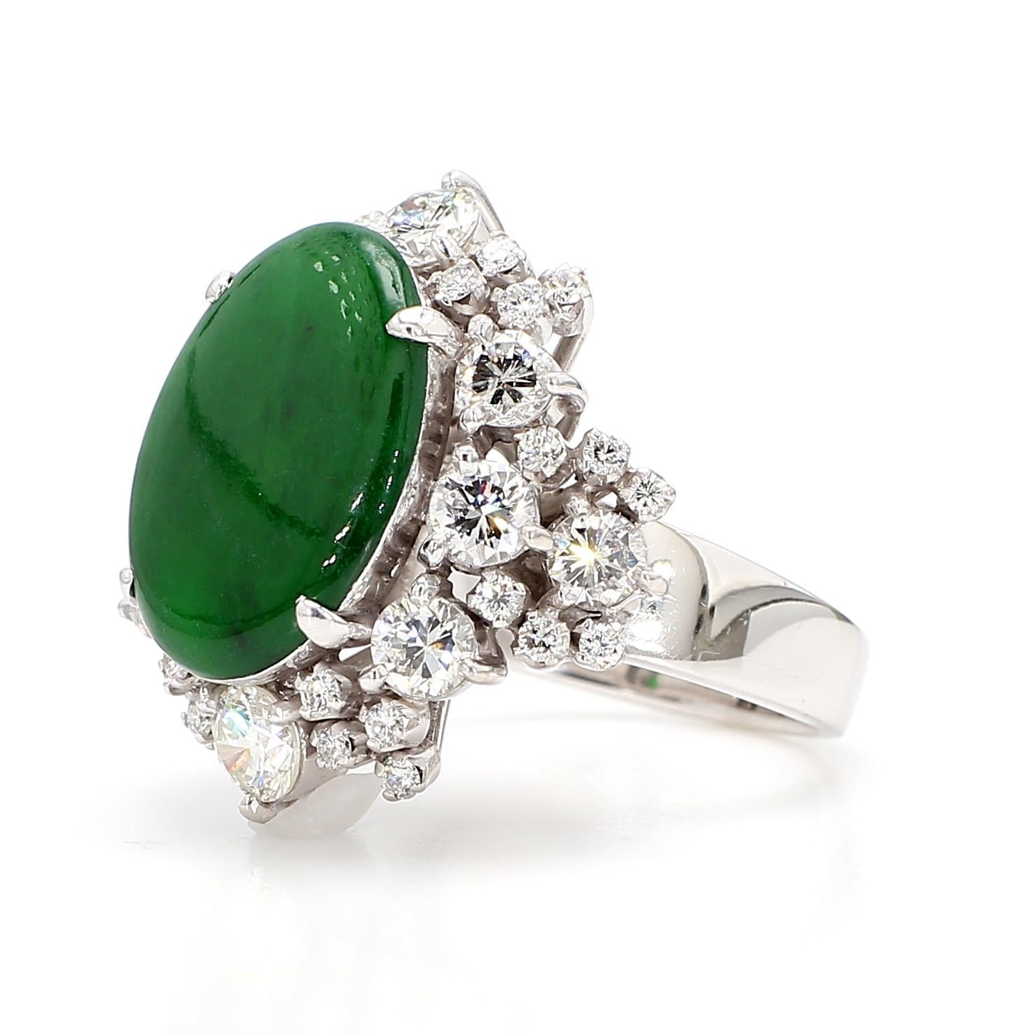 The setting is a classically proportioned double-row starburst cluster in 18K white gold, with round brilliant old cut diamonds of varying sizes arranged in two concentric radiating rows around the jade cabochon — larger diamonds anchoring the outer border and smaller stones filling the inner row, creating a full sunburst effect that dramatically frames the deep green jade center. The individual prong mounts for each diamond are raised, giving the cluster dimensional depth and allowing each stone to be viewed in full from above, while the high-polish white gold shank provides a clean, substantial base for the imposing head. The overall silhouette is reminiscent of the finest mid-century estate jewelry, where cluster diamond surrounds were the premier setting style for important colored gemstones.