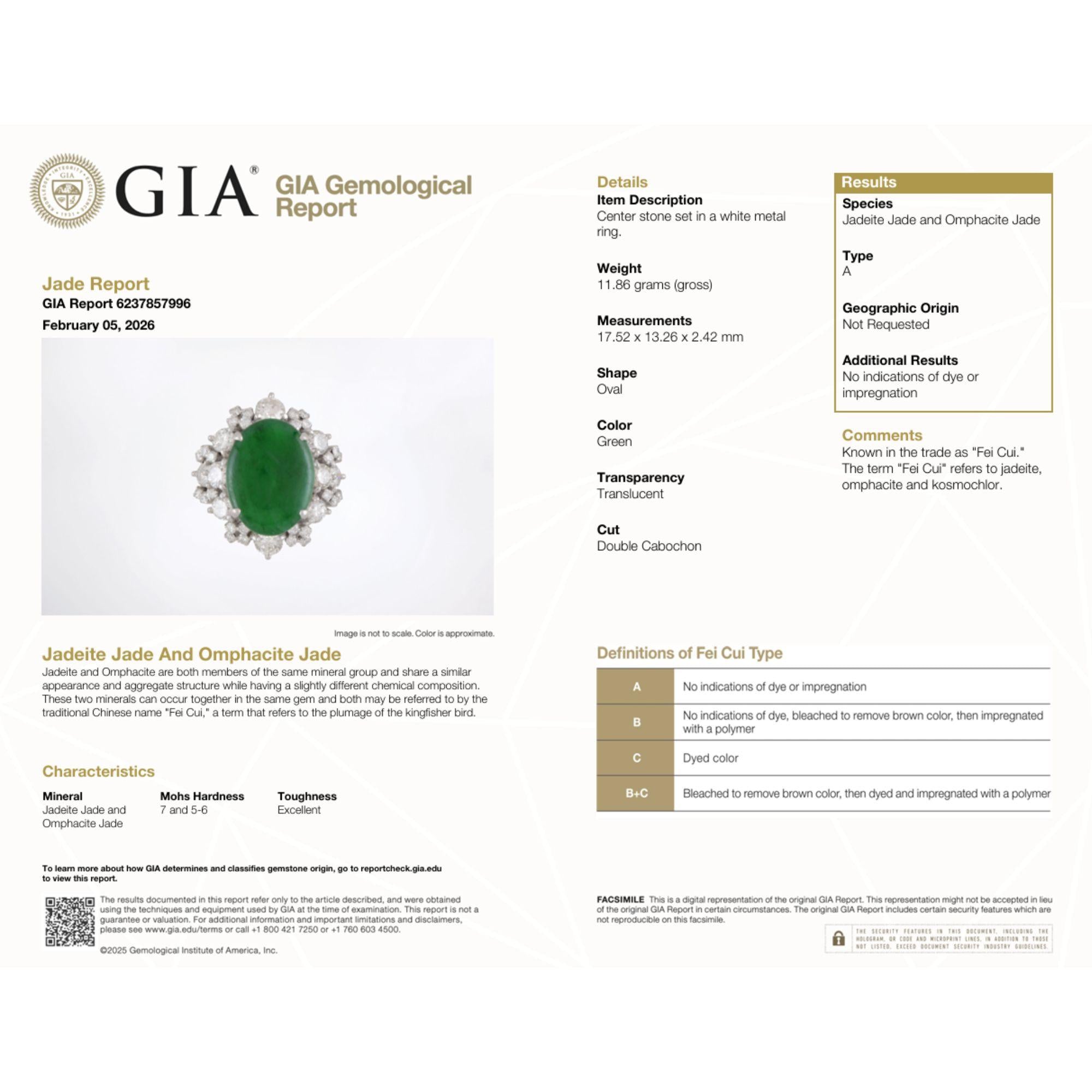 The GIA-certified Type A jadeite and omphacite jade is among the most significant designations in the colored stone world — Type A jade is entirely natural and untreated, with no dye, no bleaching, and no polymer impregnation, meaning the vivid green color and translucency are entirely the result of nature. The GIA report confirms "no indications of dye or impregnation," placing this stone in the highest tier of jade quality and authenticity. Known in the Chinese trade as "Fei Cui" — a term evoking the plumage of the kingfisher bird — this variety of jade is the most prized in Chinese culture and commands extraordinary premiums over treated jade. Measuring 17.52 x 13.26mm with translucent clarity and deep green color, this cabochon displays the characteristic waxy luster and inner light that defines fine jadeite at its best. For collectors of Asian luxury objects or fine gemstone jewelry, a GIA-certified Type A Fei Cui jade of this size and color is an exceptional and increasingly rare acquisition.