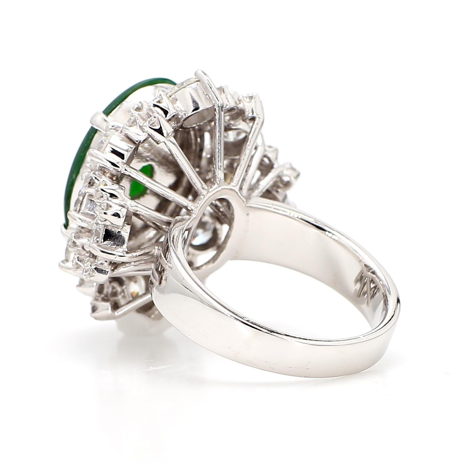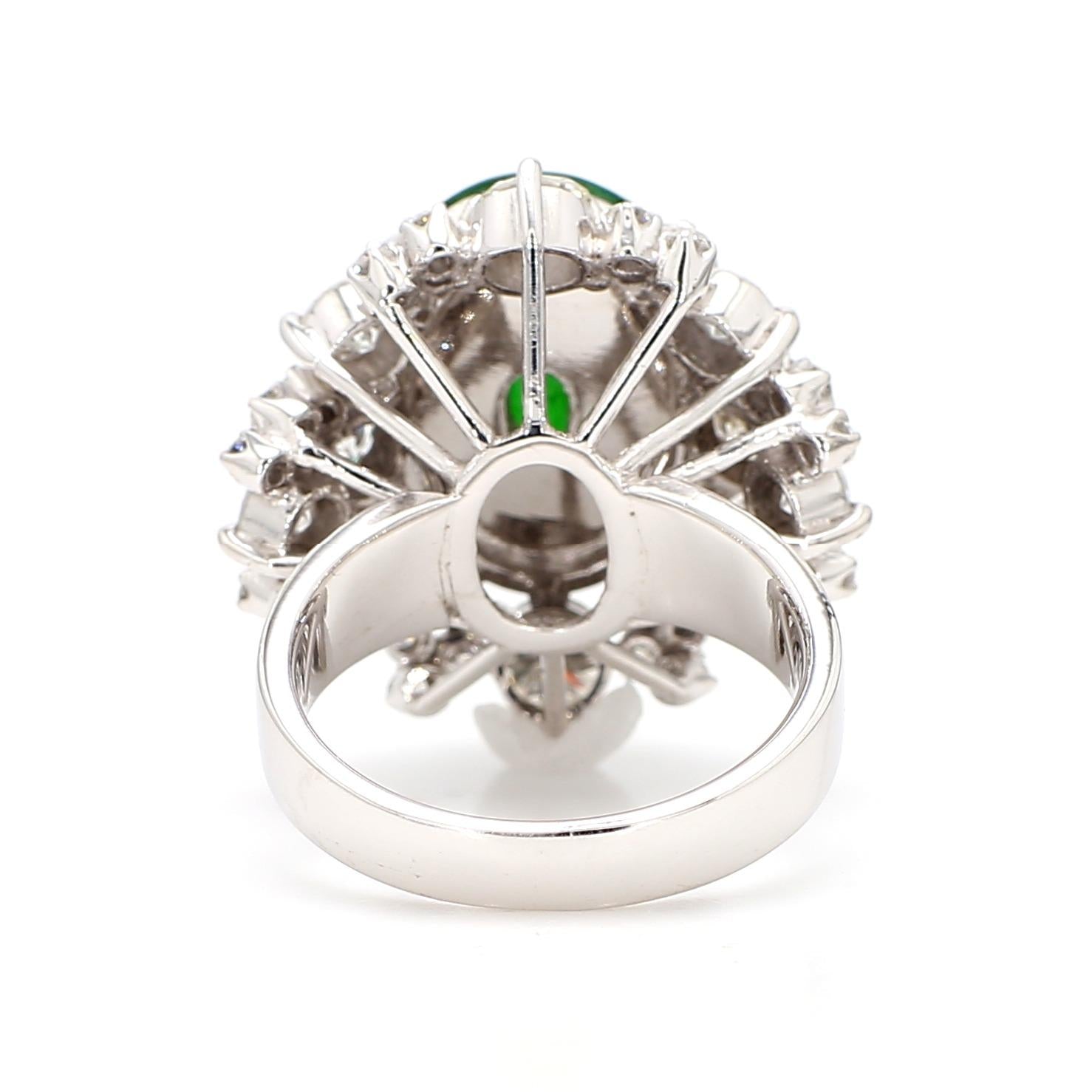 GIA-certified Type A jadeite and omphacite jade oval double cabochon and approximately 3.00 carat old cut round brilliant diamond F-G/VS 18K white gold cocktail ring, featuring the vivid green untreated jade in a prong setting surrounded by a grand double-row starburst cluster halo of old cut diamonds radiating outward in a classic sunburst formation. Size 7, adjustable.