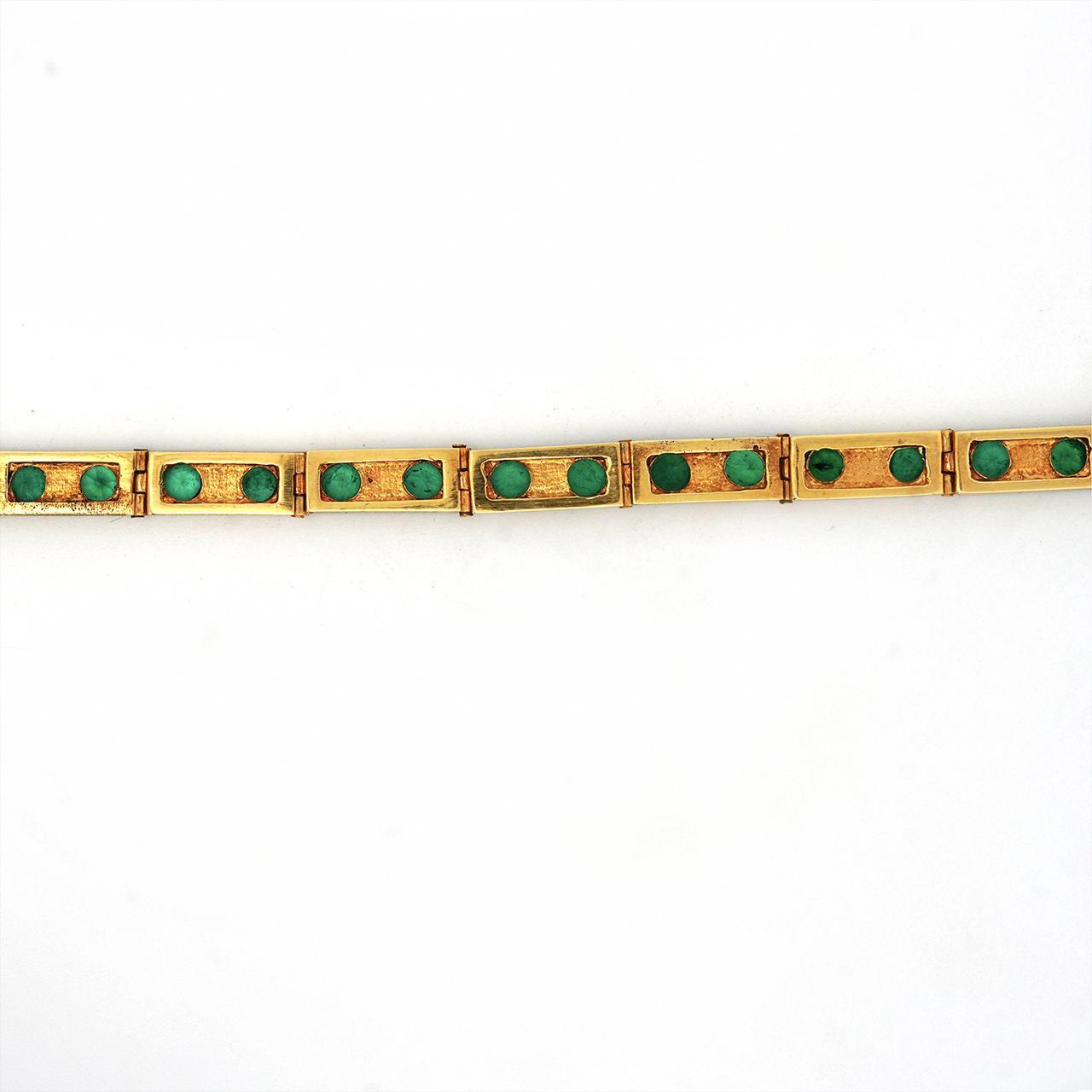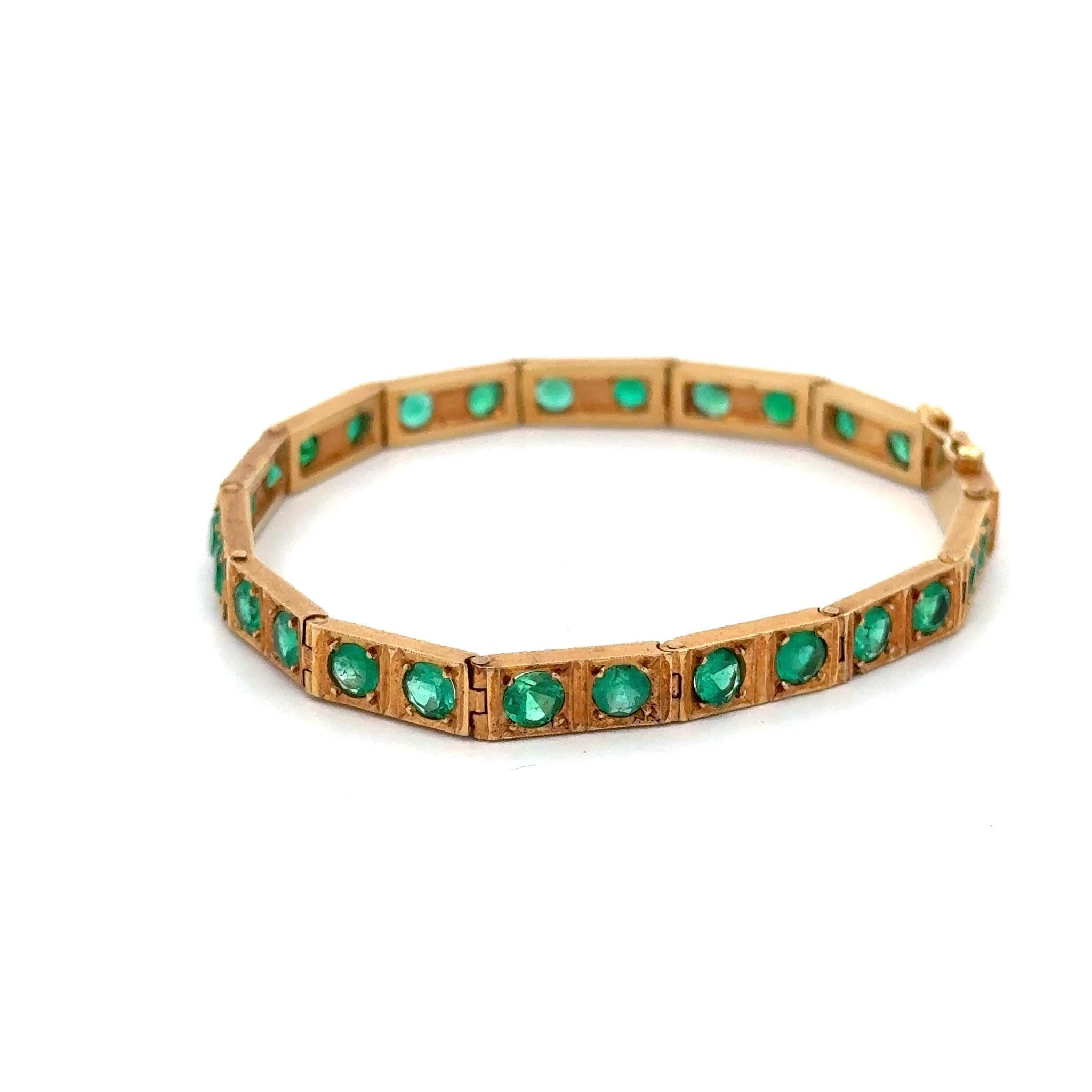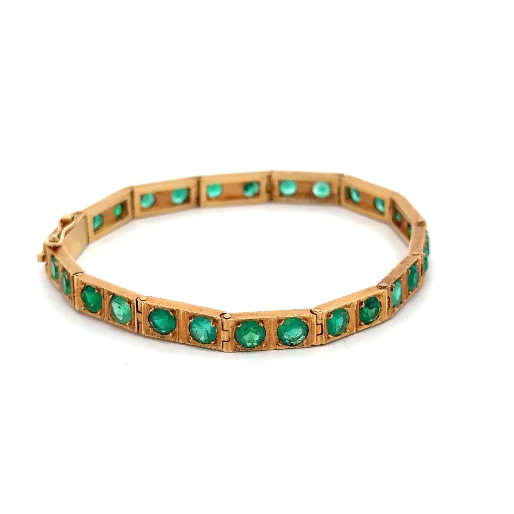 Vintage 18K yellow gold bracelet featuring 26 high-quality Colombian emeralds totaling 7.0 carats set in individual box link settings with secure box clasp closure. Each 5mm emerald displays rich green color in this substantial 18-gram matte finish bracelet measuring 7 inches in length and 2.4mm thick.