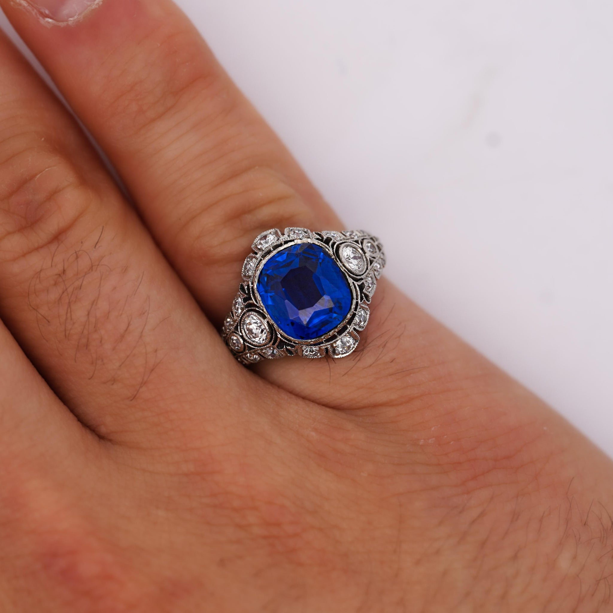 Vintage Art Deco platinum mounting showcases intricate metalwork with geometric precision and ornamental filigree detailing throughout. Cushion-cut sapphire sits within milgrain-edged bezel surrounded by diamond halo creating brilliant frame. Ornate shoulders feature bezel-set diamonds arranged in circular patterns connected by pierced filigree metalwork and black enamel accents. Gallery exhibits openwork construction allowing maximum light entry while maintaining structural integrity. The mounting represents quintessential Art Deco aesthetic with symmetrical design and decorative elaboration.