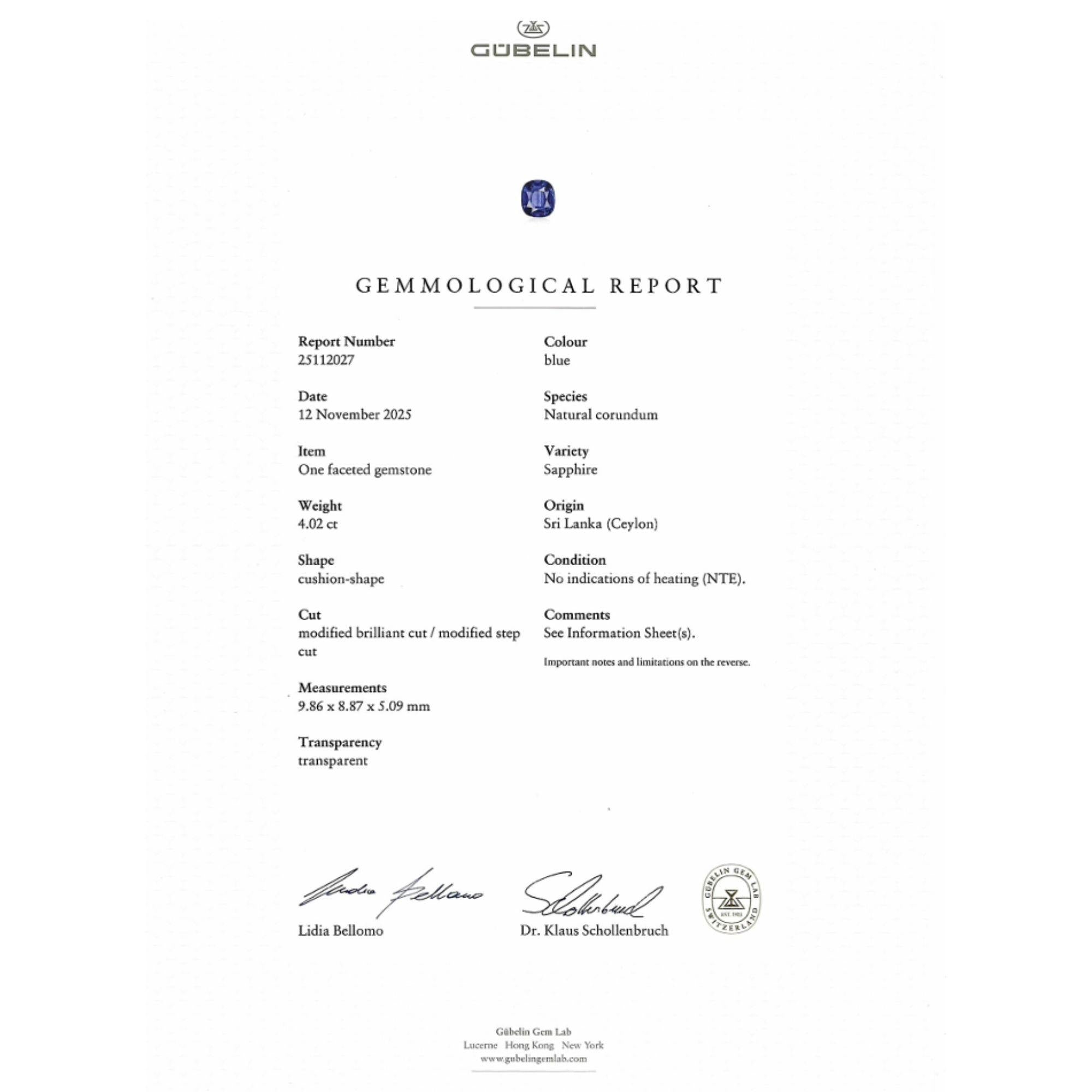 This 4.02 carat Ceylon sapphire exhibits rich royal blue color with exceptional transparency and cushion cut proportions. No-heat treatment designation confirms the stone's natural color without thermal enhancement, significantly increasing value and desirability. Dual certification from Gubelin and AGL, two of the world's most respected gemological laboratories, provides comprehensive authentication and quality documentation. Ceylon sapphires from Sri Lanka remain among the most prized colored gemstones for their superior color saturation and transparency.