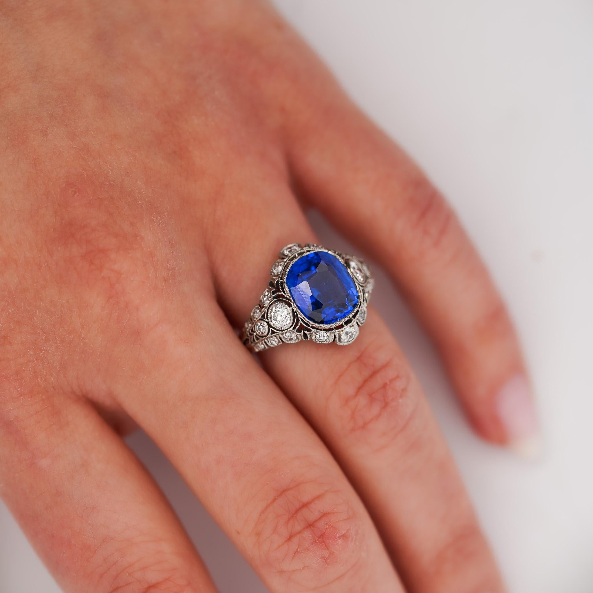 AGL and Gubelin certified no-heat 4.02 carat cushion cut Ceylon sapphire set in vintage platinum Art Deco original mounting with diamond halo, handmade filigree, milgrain, and ornate diamond pierced shoulders.