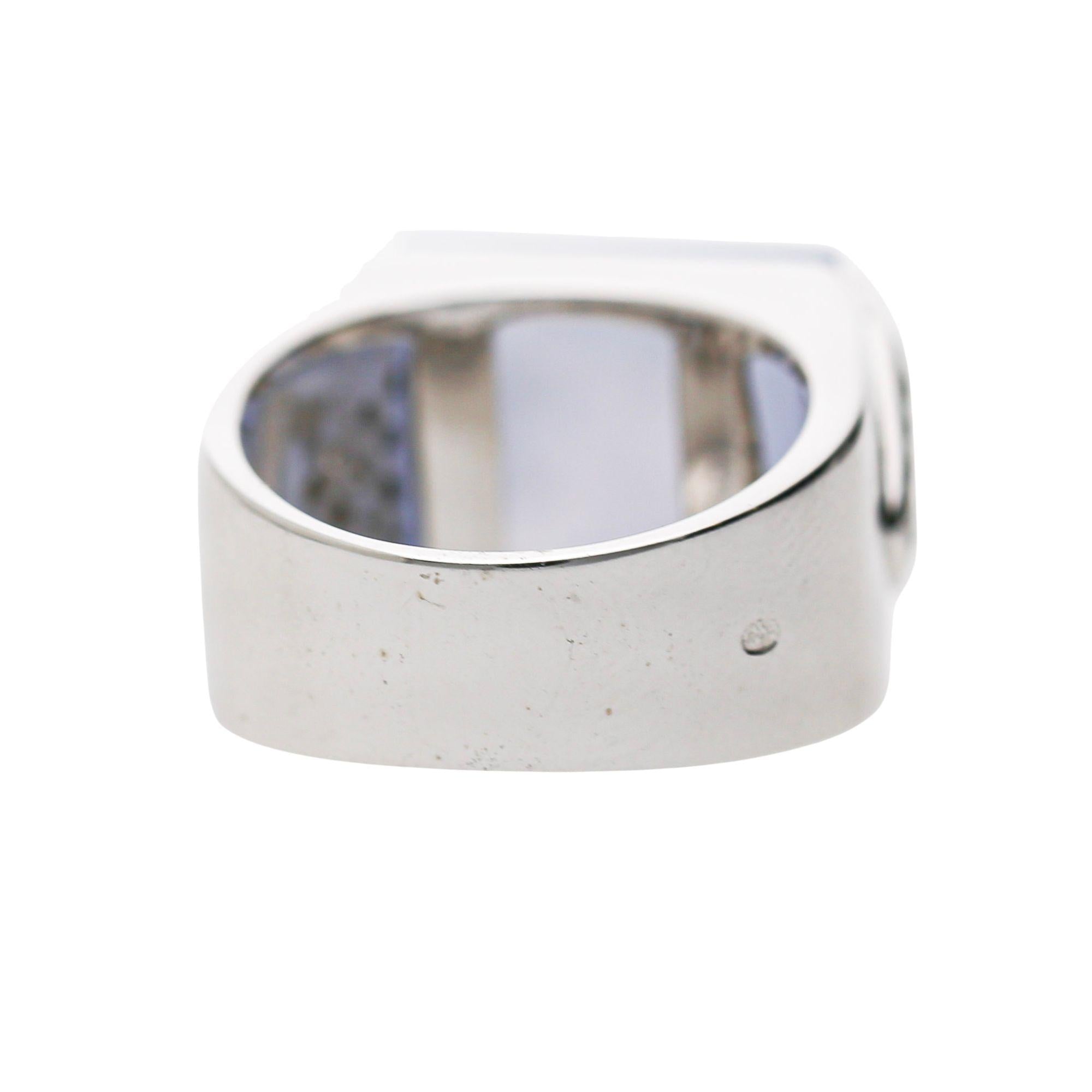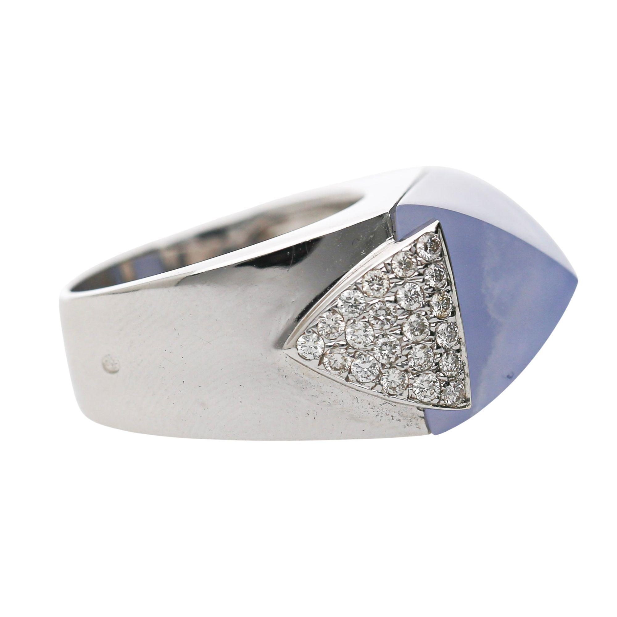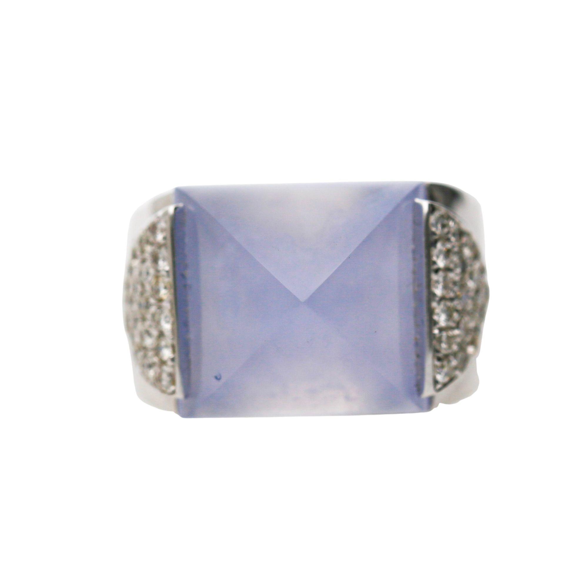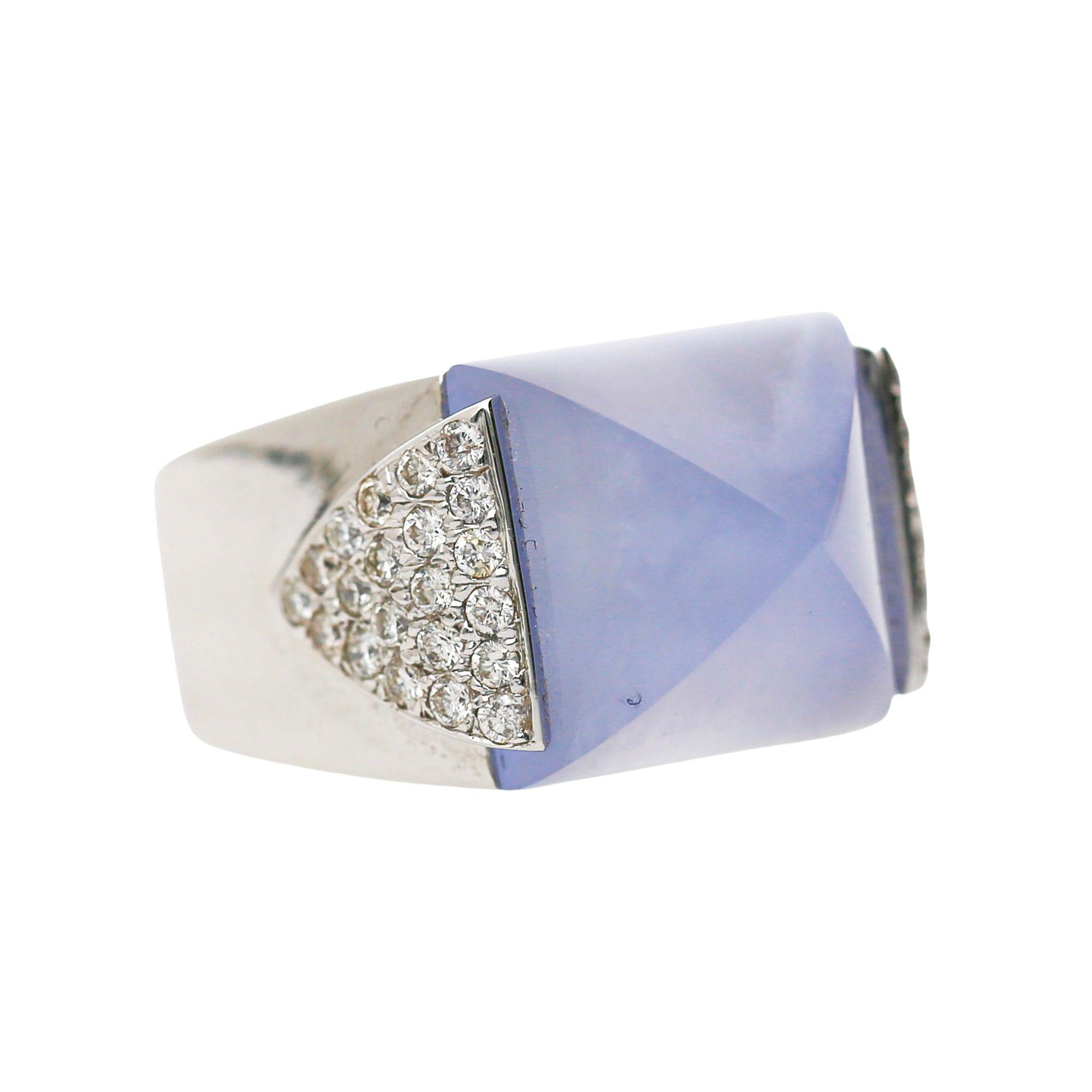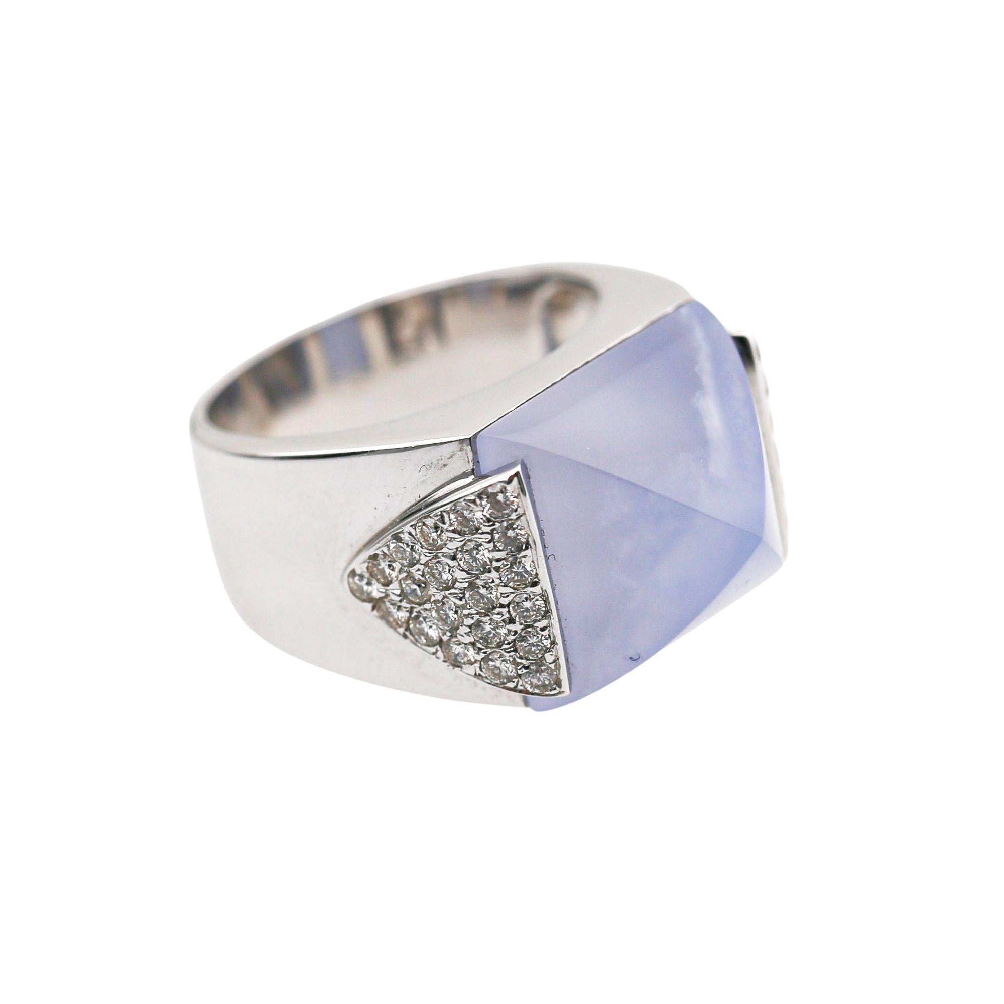The 18K white gold mounting is architecturally bold — a wide, high-polish band that rises dramatically at the shoulders into two triangular pavé-set diamond panels that flank the sugarloaf chalcedony on both sides, creating a geometric Art Deco-inspired silhouette when viewed from the front. The sugarloaf stone sits flush within a clean rectangular frame at the center of the ring, with its pyramid tip pointing upward to create a distinctive three-dimensional crown effect that is entirely unique to the sugarloaf cut. The wide polished shank tapers from broad shoulders to a comfortable band width at the back, making this bold statement ring surprisingly wearable for daily use.