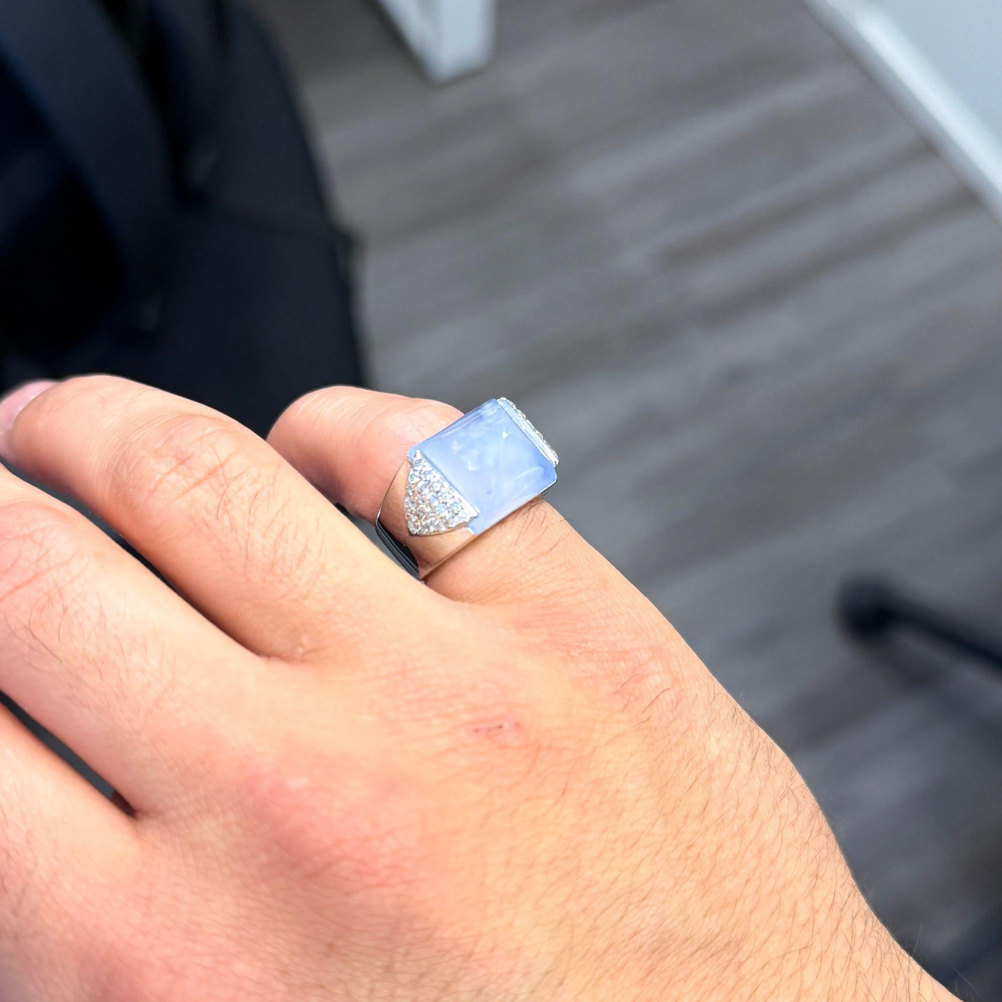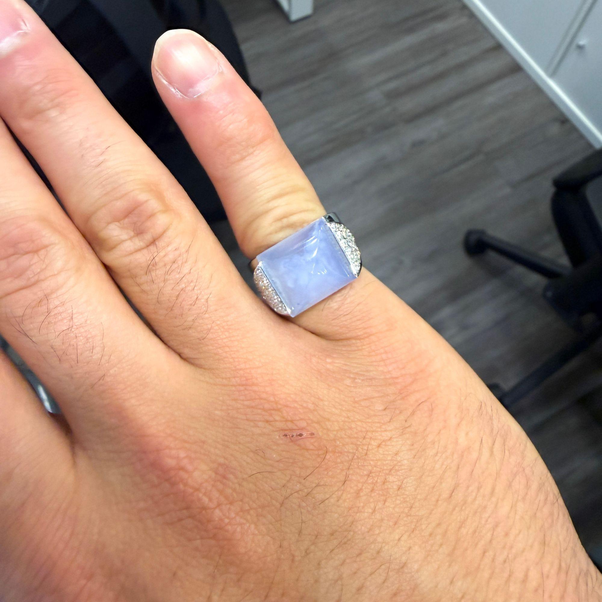 The 11.97 carat blue chalcedony displays the soft, milky lavender-blue color that makes this variety of cryptocrystalline quartz one of the most serene and wearable gemstones in fine jewelry — its translucent glow diffuses light evenly across the sugarloaf surface rather than reflecting it sharply, producing a calm luminosity that is entirely different from faceted stones. The sugarloaf cut, with its smooth curved sides rising to a central point, is a sculptural cutting style that emphasizes the stone's translucency and color depth while giving the ring a bold three-dimensional presence on the finger. The 42 round brilliant diamonds totaling 0.40 carats set in the triangular shoulder panels introduce bright white sparkle that contrasts beautifully with the soft muted blue of the chalcedony. At nearly 12 carats, this chalcedony is a substantial and visually commanding center stone that delivers maximum color impact at an accessible price point relative to precious gemstones of equivalent size.
